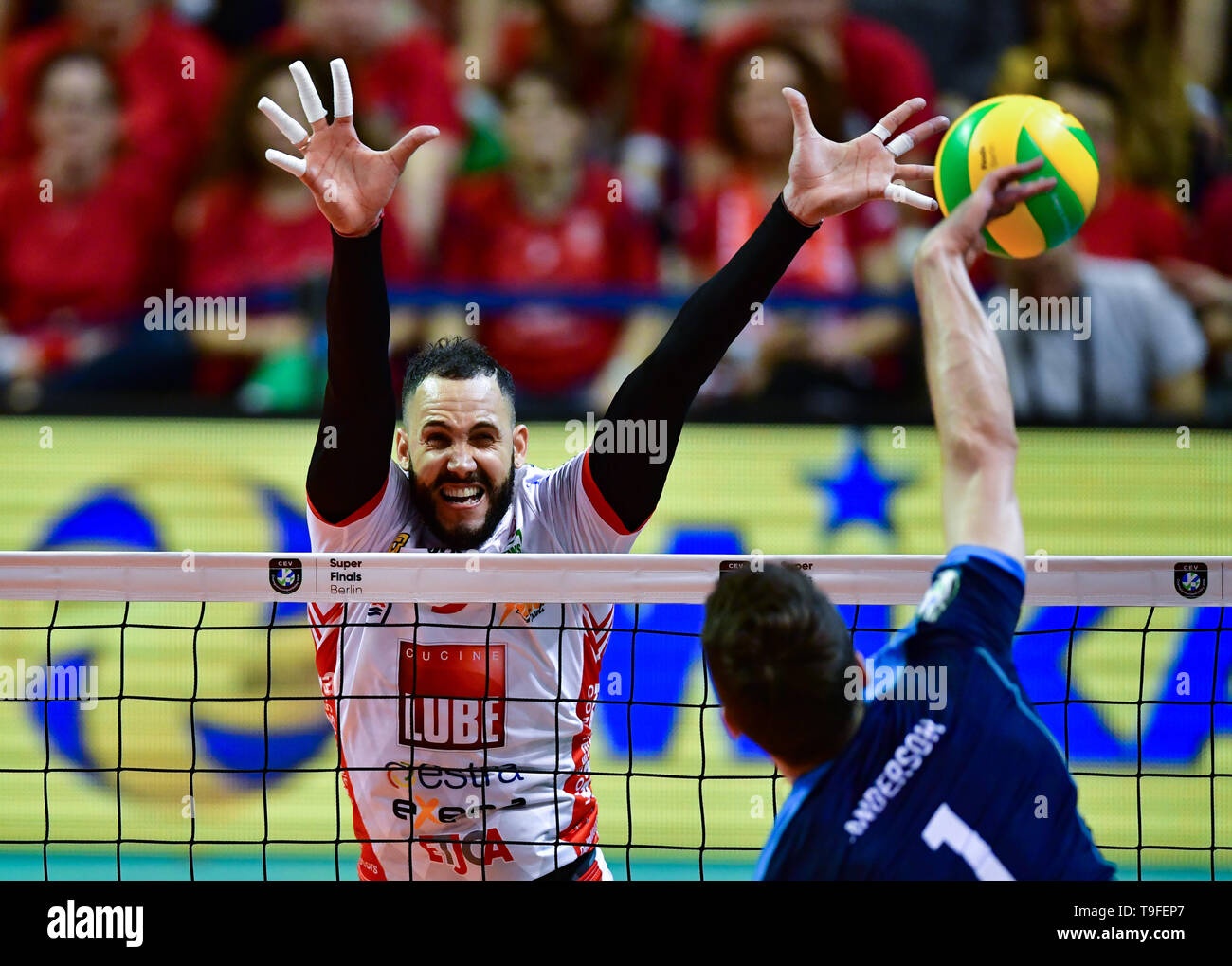 https www alamy com berlin germany 18th may 2019 volleyball men champions league zenit kazan cucine lube civitanova knockout round final artem volvich l and matthew john anderson of kazan block the ball credit soeren stachedpaalamy live news image246817937 html