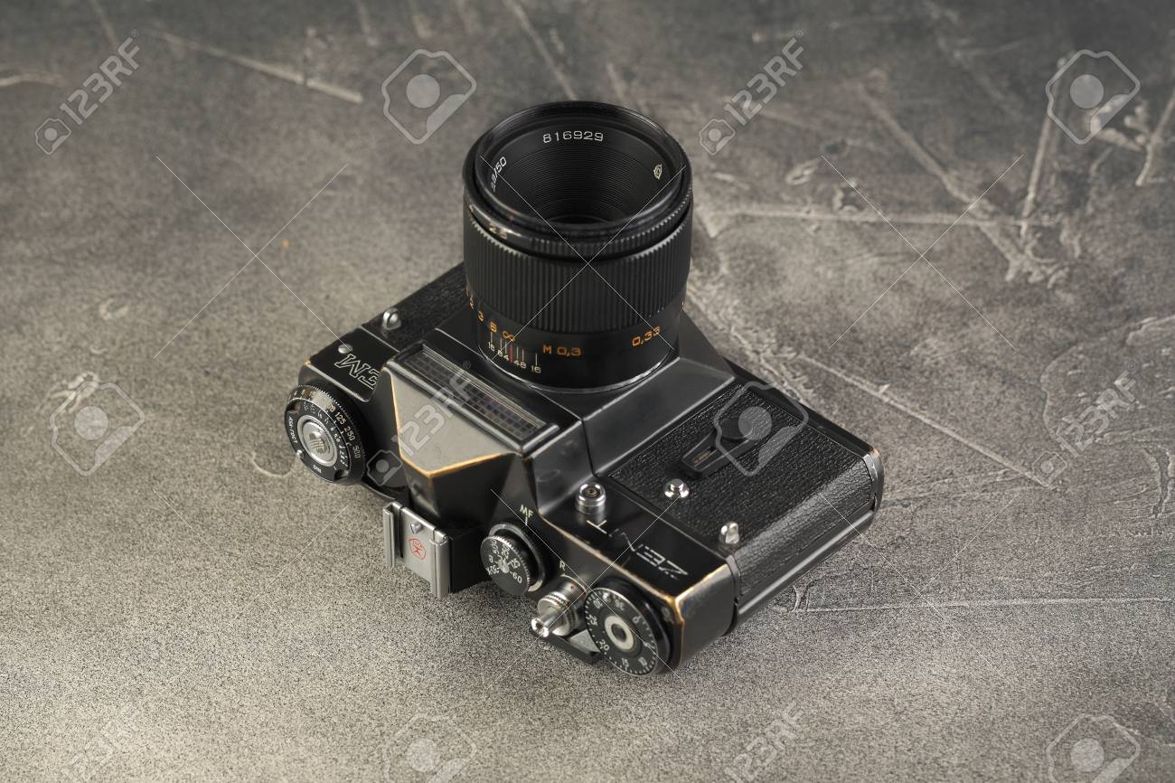 https www 123rf com photo 125168330 moscow russia april 22 2019 the old soviet 35 mm slr film camera zenit em released 1980 on gray ceme html
