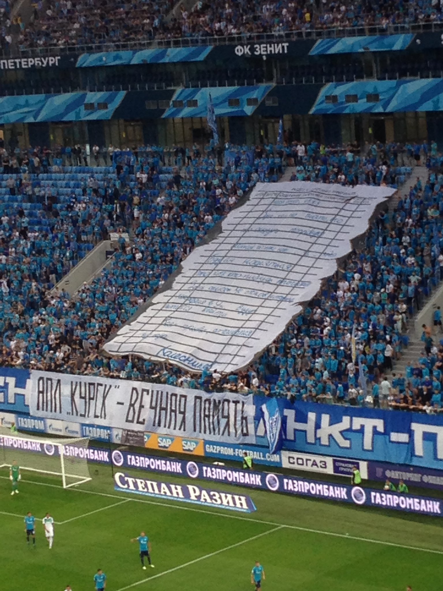 bolelshiki fk zenit razvernuli na tribune banner v pamyat o pogibshih moryakah na kurske foto trust ua